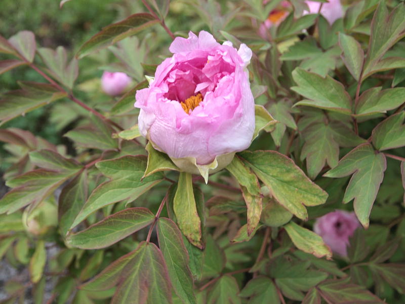 夕方になって外から帰ってきて、ひょっとしてと思いボタンの方へ行ってみると、今朝つぼみだったものが咲き出しました。明朝には開ききると思います。このボタンは在来種のボタン色の代表のような花ですが、ここでは例年一番早く咲く株です。幾つか咲いているだけで花の香りが周囲に漂っています。