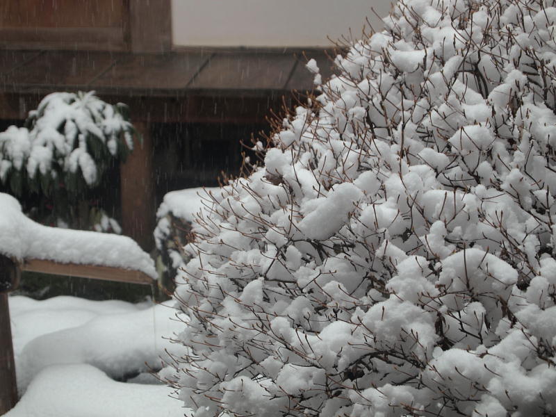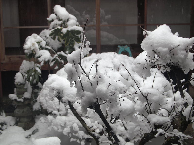 朝方から雪が舞いました。実質この冬初めての雪となりました。段々量が降りご法事に出かける頃は休日と言うこともあって道路にも残りだしました。出かけるときには「もんぺ」「長靴」持参です。祭壇前の法要の後、もんぺ・長靴を履いてのお墓参りとなりました。最近整備されたその墓地は通路に磨かれた石が使われているので非情に滑りやすく、施主の方は「あぶない、あぶない」で済みましたが、若いお婿さんは転んでしまいました。施主(私より若い)大爆笑。「笑っちゃいかんでしょ」は私。