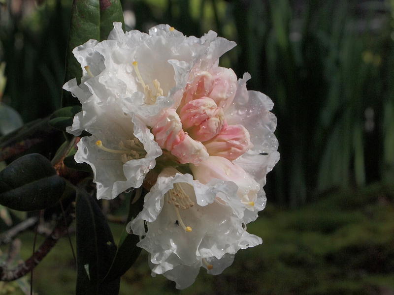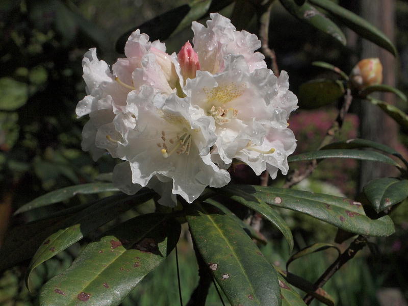 このシャクナゲは園芸品種で、「 snow white(雪白) 」と名がついていました。この国では「 snow white 」は「白雪姫」と訳されますので、「雪白」が適当かどうかは不明です。