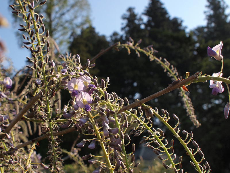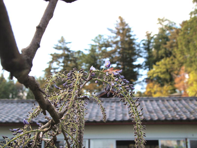 今朝も霜が降りました。下のボタンで葉の上の白いものは霜です。地表に近い、棚ではないフジは花芽が枯死したものがあります。棚のものは地上高があるためか影響はないようです。