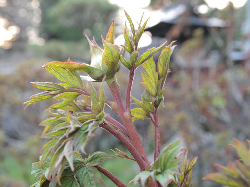 ボタンのつぼみも段々大きくなってきました。葉も同じように大きくなるので、つぼみの周りを囲んでいる状態はそのままです。シャクナゲは見たところ何も変化が無く、つぼみを触ってみてもまだ「さらさら」しています。