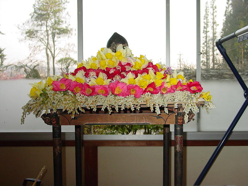 明日は花まつり。お釈迦さまのお生まれになった日です。花御堂(ハナミドウ)を作り小さなお釈迦さまを安置し、甘茶を掛けます。その支度。花は、ツバキ・レンギョウ・スイセン・コブシ・アセビを使いました。