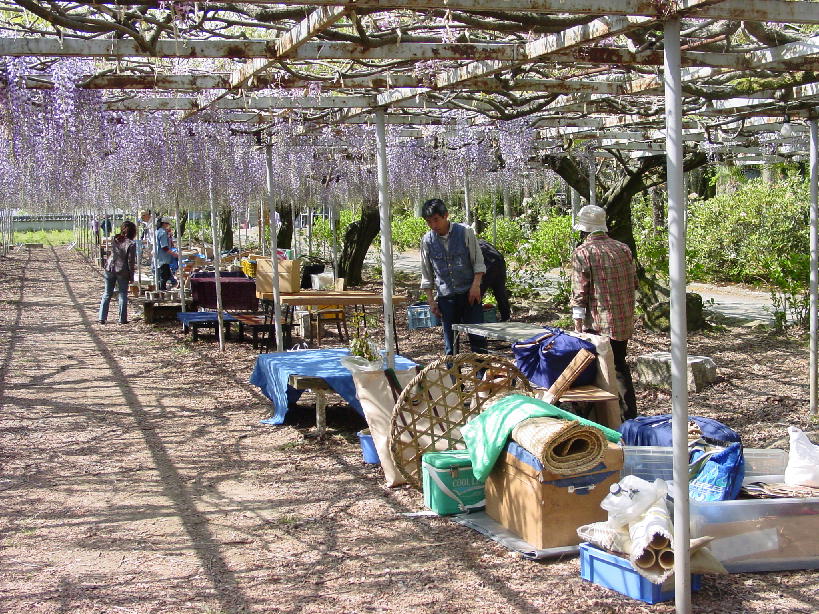 ブルーシートなどが見えなにやら怪しい雰囲気ですが、「クラフトまつり@大きな藤の木の下で」の準備の様子。天候に恵まれ大勢お客様がありました。