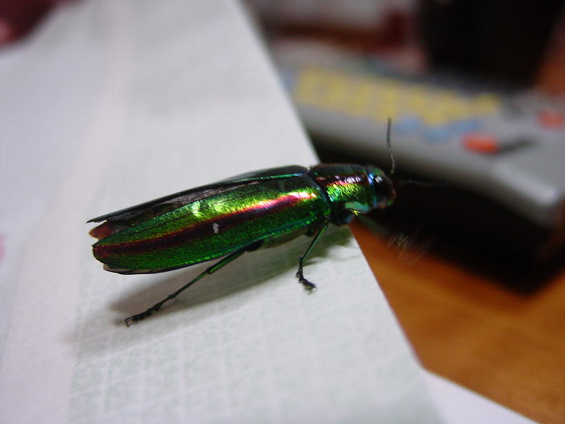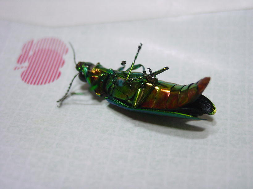 生きているタマムシを捕まえたのは初めてで、記念写真を撮りました。彼(彼女?)には心外だったようで、紙の上に置くと意外なほどの早さで動きピントが合いにくくなりました。