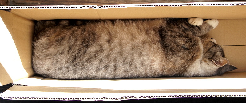 暖かくなり、段ボール箱大好きで、日当たりの良い箱の中に入ったらこんな事になってしまいました。熟睡中…