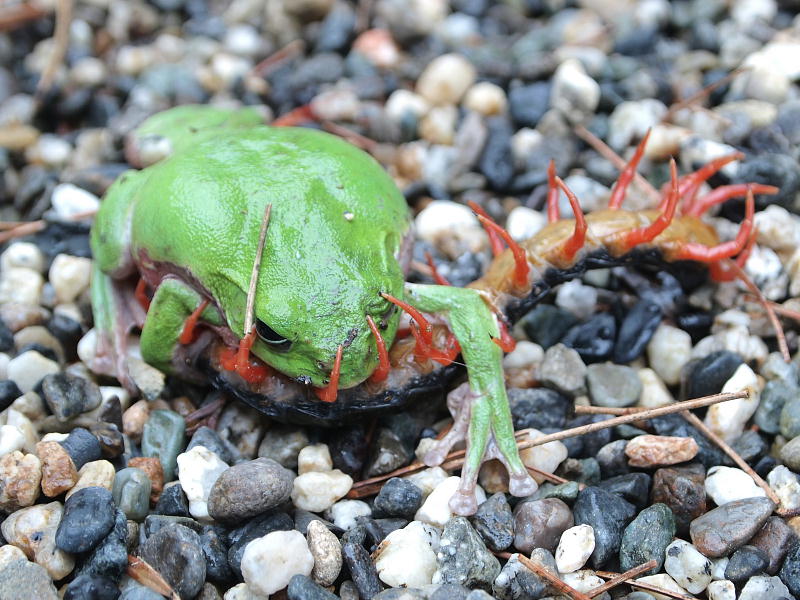 ムカデや蛙を気味悪いと思う方は「続きを読む」をクリックしないでいただきたいが、今日夕方家内が大声を出して呼ぶので行ってみると、カエルとムカデが絡まっている。どちらかがどちらかを食べようとしたのだろうが、見たところよく判らない。ネットで見ると、カエルはもちろん虫類を食べるし、ムカデも小動物を食べるらしい。カエルはまだ元気だが、噛みつくような歯は持っていないだろうし、ムカデも致命傷を与えられないようだ。絵に描いたような「漁夫の利」の場面なのだが、じゃぁ捉まえていって食べる気にはならない。